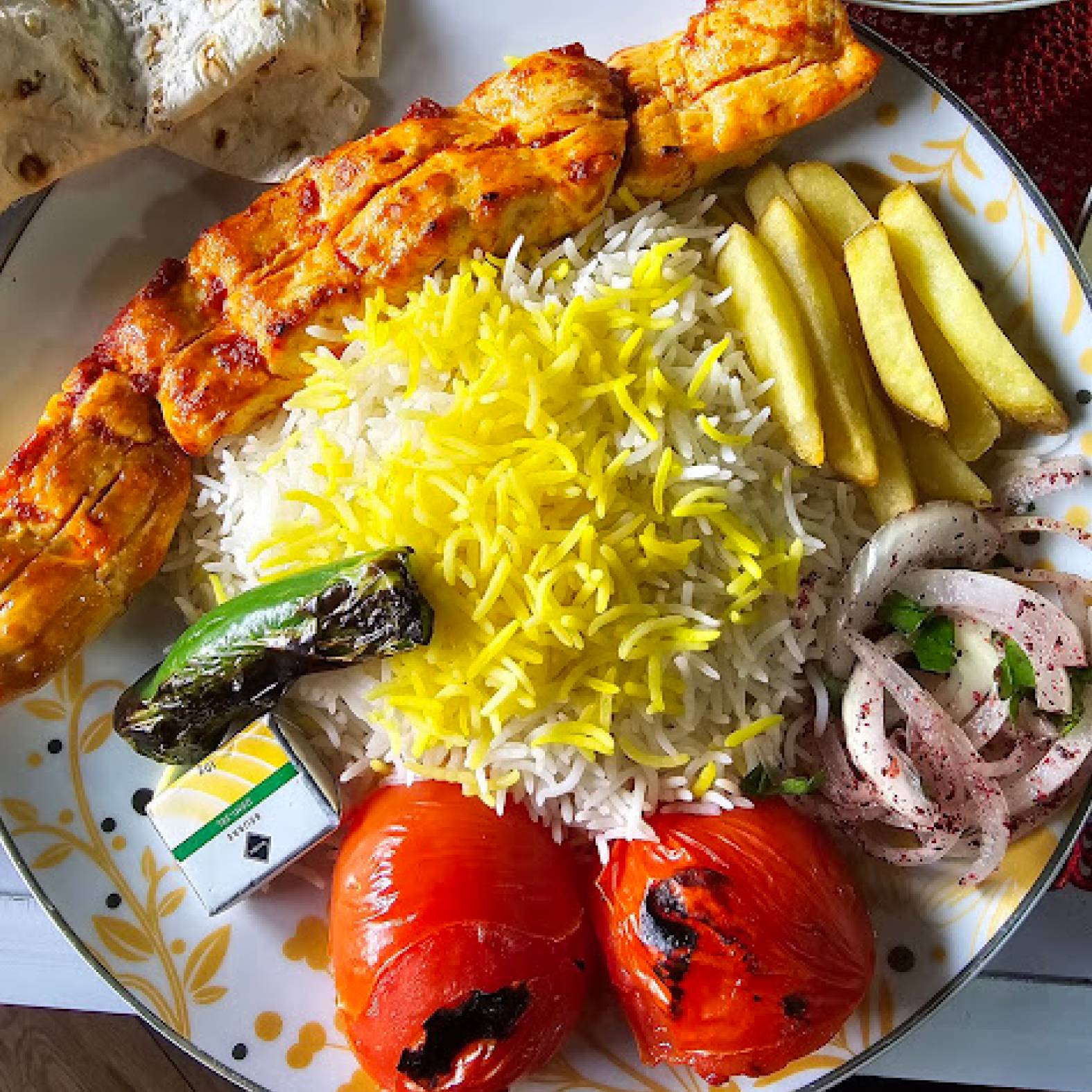 Une brochette de koubidé + une brochette de tchène-djé, avec au choix riz, frites ou pain lavaash