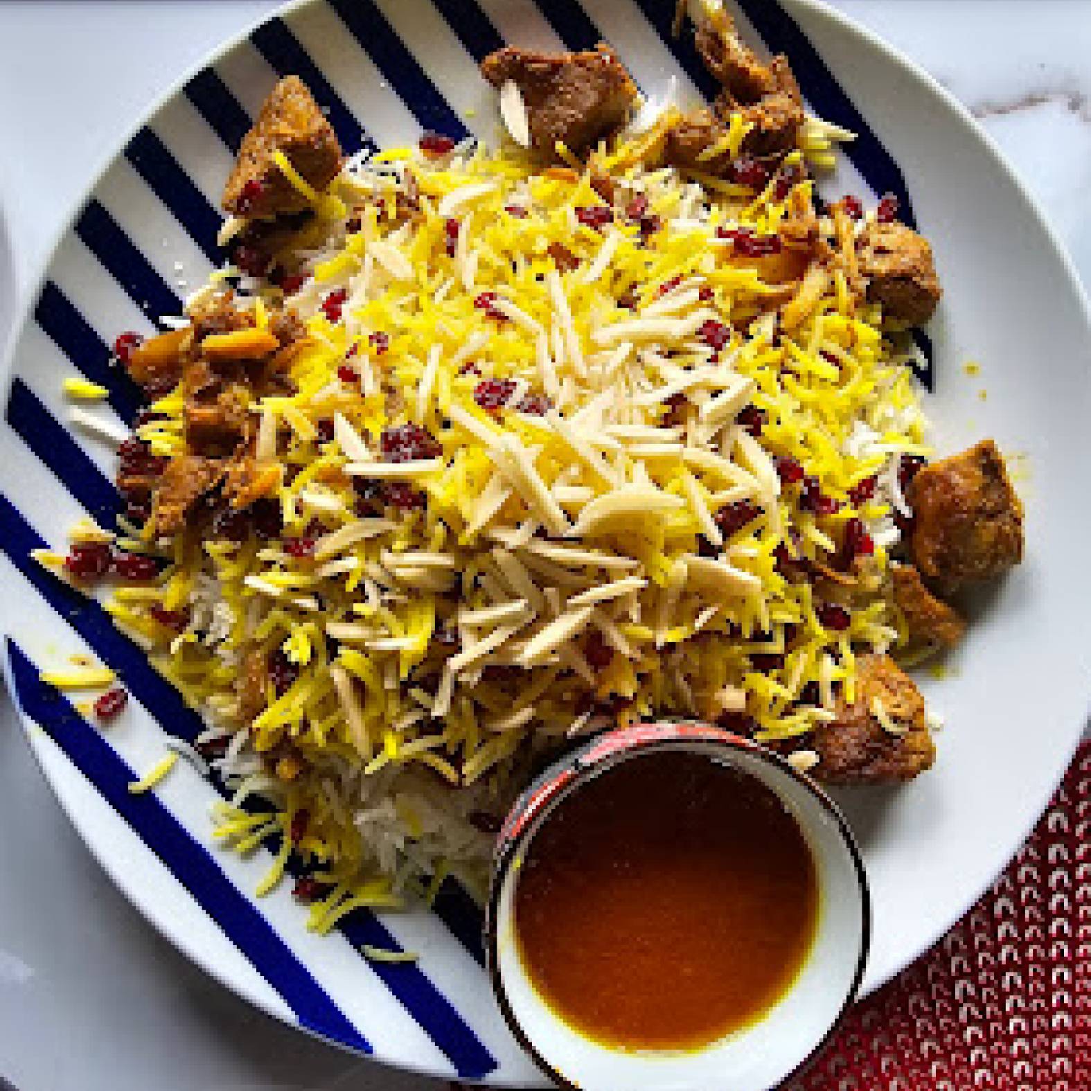 Agneau cuit dans une sauce aux zestes d’orange, avec riz, amande et baies d’épine vinette